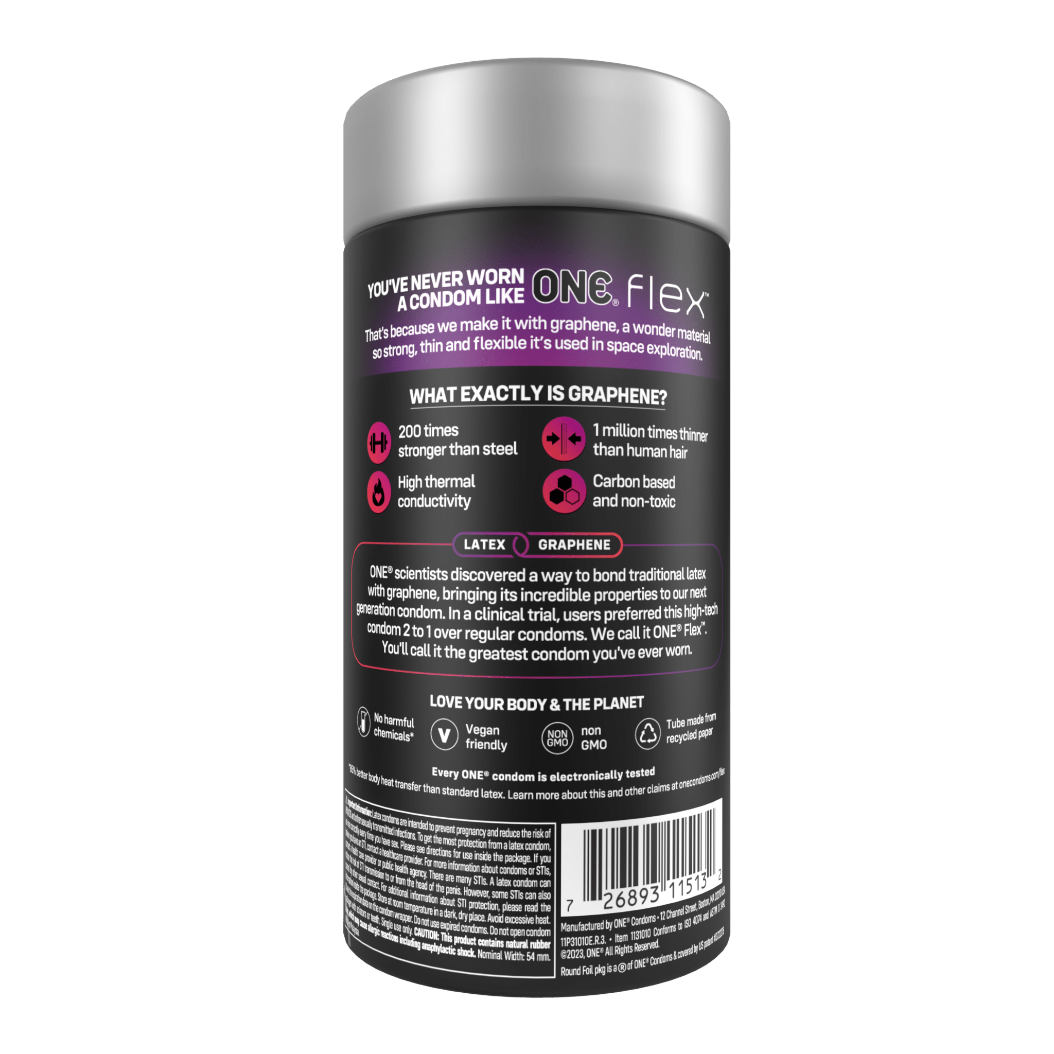 ONE® Flex™ combines our premium, vegan latex with graphene, a wonder material so strong, thin, and flexible, it’s used in space exploration. Experience improved skin-on-skin sensation and out-of-this-world pleasure with the world’s first graphene condoms.