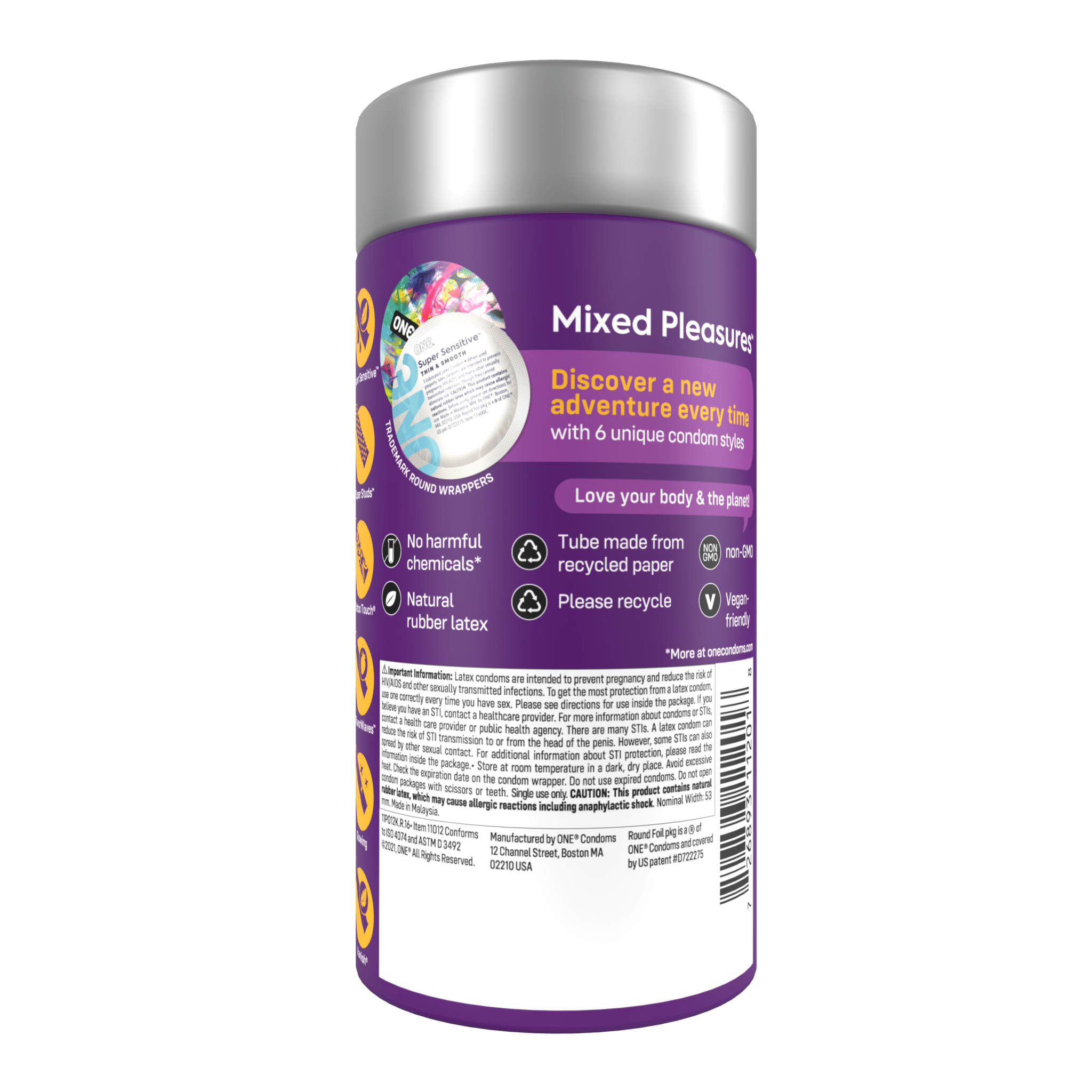 Our popular variety packs feature unique styles for adventurous experiences! All ONE® Condoms feature Sensatex® ultra-soft latex for a more natural pleasure feeling, and are vegan-friendly, non-GMO, and made with natural rubber latex.